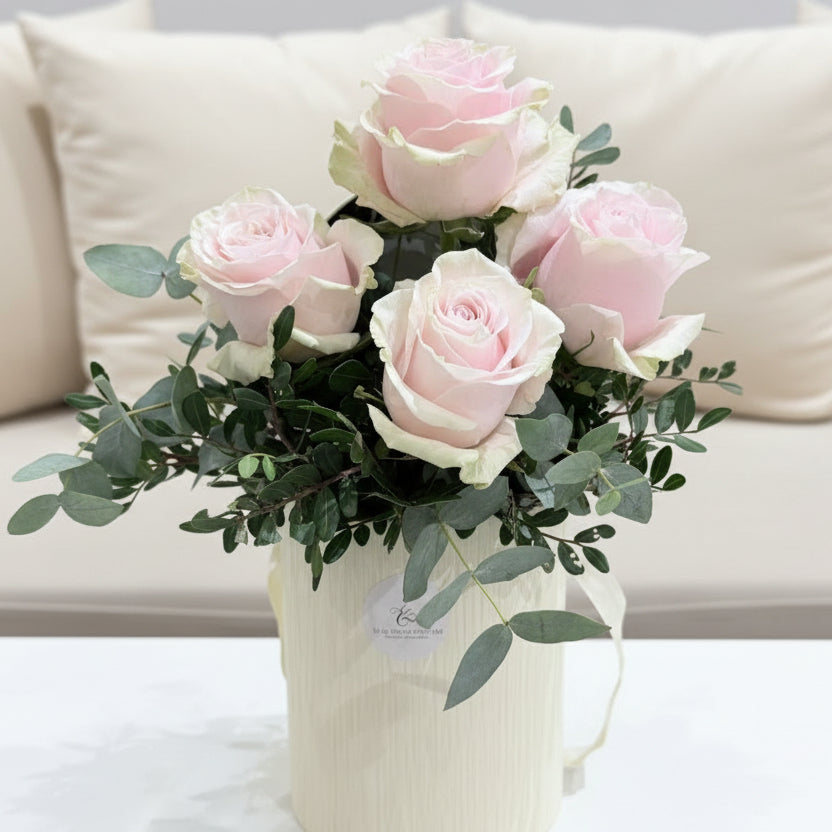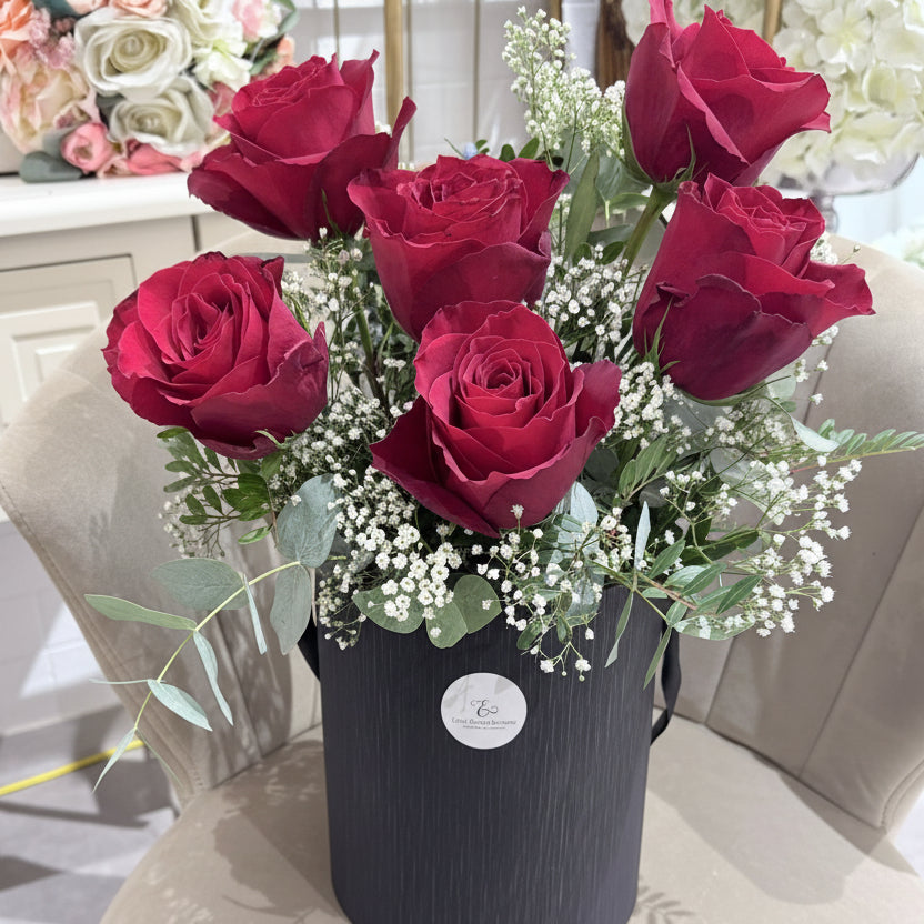 Elevate your floral gifting with our Affection Hat Box, a sophisticated presentation of premium roses paired with delicate gypsophila. This expertly curated arrangement combines timeless elegance with modern styling, housed in a distinctive round hat box that transforms the presentation itself into a keepsake. Perfect for marking special occasions or expressing heartfelt sentiments, each bloom is selected for quality and longevity. The interplay of full-bodied roses and airy filler creates visual depth and movement, while the circular design offers a refined alternative to traditional rectangular arrangements. An ideal choice for those who appreciate refined floristry and lasting impressions.